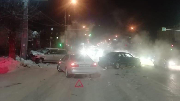 Автомобиль Nissan Presage у дома №48 по Большевистской столкнулся с поворачивающей Toyota Vista. В результате сильного столкновения автомобили раскидало в разные стороны. Vista врезалась в Nissan Maxim, Presage влетел в рекламную опору.