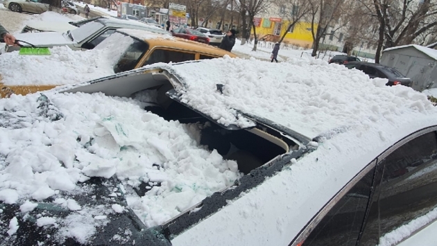 В центре Омска сошедший с крыши снег пробил стекло припаркованного автомобиля