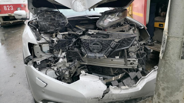 В центре Самары иномарка врезалась в столб на трамвайных путях
