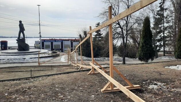 На набережной скоро начнется активная фаза работ по благоустройству, место работ огораживают забором, но до 13 апреля пространство вокруг памятника останется свободным.