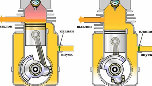 В двухтактном двигателе рабочий ход осуществляется за один подход (один поворот коленвала). Поэтому двухтактные двигатели могут вполне нормально вращаться как в одном, так и в другом направлении. Такая технология применяется в крупных судах. Задний ход обеспечивается именно вращением двигателя в обратном направлении.