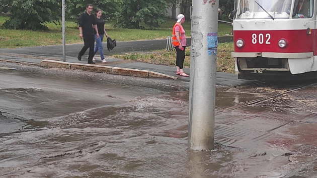 Путь электрическому транспорту вечером субботы, 29 мая, преградила вода на проезжей части. В месте пересечения улицы Ерошевского и трамвайных путей есть ливневый сток, но, видимо, что-то пошло не так. Водитель и кондуктор трамвая пытаются убрать воду с дороги, но пока не решаются продолжить движение. Трамваи по направлению в город по Ново-Садовой после Постникова оврага следуют в обычном режиме.