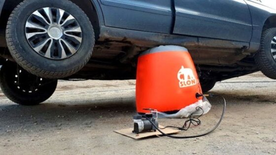 Для проведения работ домкрат в сдутом состоянии подкладывают под авто и подключают к компрессору, затем нагнетают воздух. Если положить его по центру, «Слон» поднимет одновременно оба колеса. Прибор легко использовать даже женщинам и пожилым водителям. В сложенном виде он занимает мало места, домкрат можно поместить в салон или багажник.