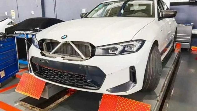 На изображении показана передняя часть 3-Series с новым дизайном бампера и переработанными фарами. Решетка радиатора, судя по фотографиям, осталась прежней.