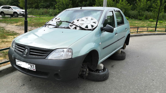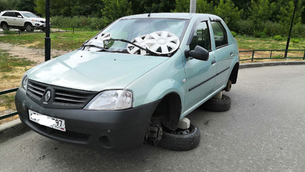 Мужчина парковал свой автомобиль Renault Logan во дворе дома №33 корпус 4 по Московскому шоссе. В результате у него сняли колёса и положили и кирпичи, а «колпаки» оказались на переднем стекле.