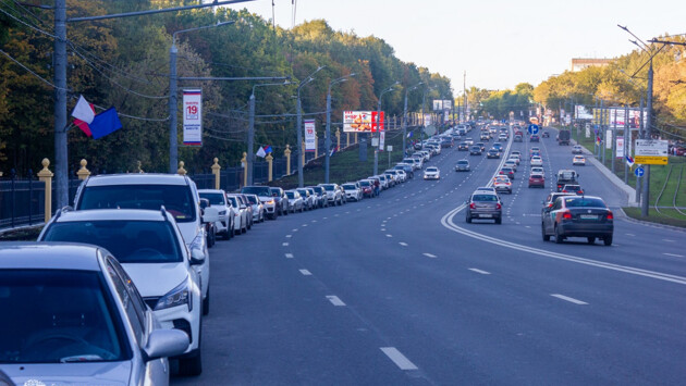 Автомобили заполнили не только полосы проспекта, парковку вдоль парка, но и близлежащие газоны.
