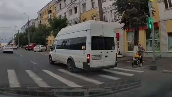 Водитель маршрутки не притормаживает перед зеброй, а, напротив, проскакивает ее перед самым носом у женщины. Если бы она сделала еще несколько шагов, то оказалась бы под колесами.