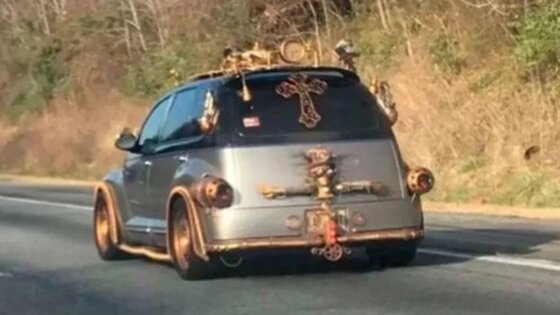 Возьмём, к примеру, этот Chrysler PT Cruiser, который способен отгонять нечисть и даже участников дорожного движения. Водитель в стиле стим-панк надел крест на заднюю часть авто. Также там просматривается нечто прохожее на робота и часы.