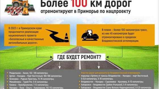 Финансирование дорожной сферы в Приморье с каждым годом увеличивается. Так, в 2021 г. в ремонтируют ремонтируют более 125 км автомобильных дорог регионального и межмуниципального значения по госпрограмме «Развитие транспортного комплекса». В 2022 г. на эти цели планируется направить более 2 млрд руб., что позволит отремонтировать почти 57 км дорог. Еще часть дорог приведут в порядок по национальному проекту «Безопасные и качественные автомобильные дороги».