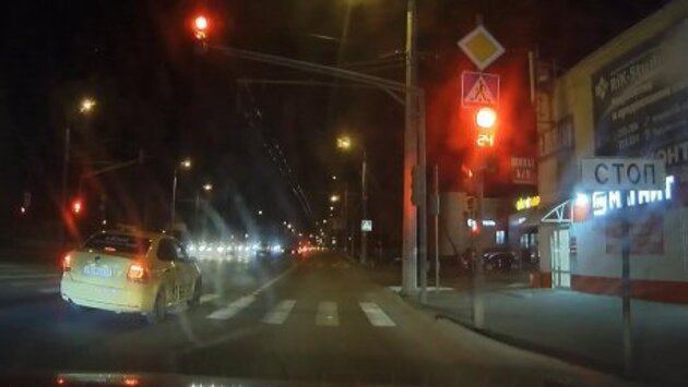 Владелец регистратора, в объектив которого попал нарушитель, двигается в направлении от центра города и останавливается на перекрестке у пешеходного перехода на красный сигнал светофора.