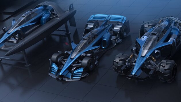 На снимках представлен транспорт, начальная форма которого представляет собой болид Формулы-1. При желании его можно трансформировать в экстремальный внедорожник для покорения дикой природы. Третья форма, которую способен принимать автомобиль - высокопроизводительный гипербоут.