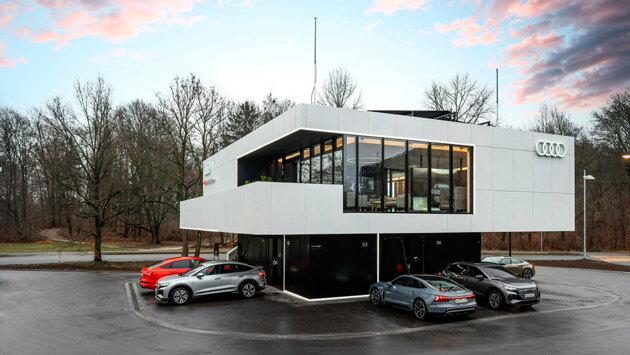 Audi charging hub, разместившийся в рамках выставочного комплекса NurnbergMesse, собран из специальных контейнеров. В нижней части оборудованы быстрые зарядные станции мощностью 320 кВт, рассчитанные на шесть электромобилей. Бронировать места необходимо в приложении myAudi. На верхнем уровне расположена клиентская зона площадью 40 кв.м.