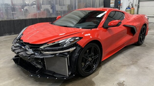 Там предлагается “спасенный” Vette, который, вероятно, побывал в небольшом ДТП. У машины отсутствуют передний и задний бамперы, а также имеются повреждения на выхлопных трубах.