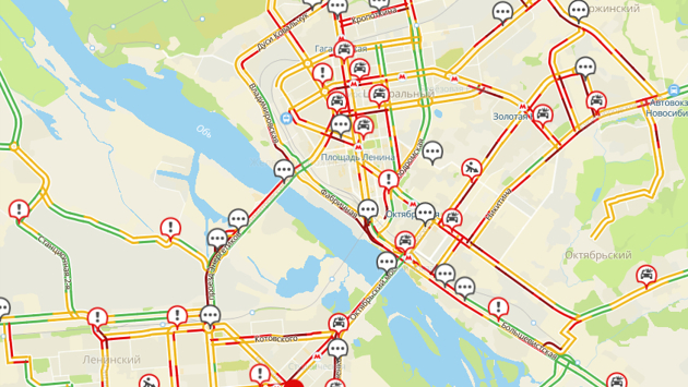Сейчас полностью заблокирован проезд по Димитровскому мосту, Октябрьский и Бугринский пока остаются относительно свободными. Не левом берегу труднее всего проехать по улице Сибиряков-Гвардейцев — на виртуальных картах она отмечена красным цветом почти по всей длине.