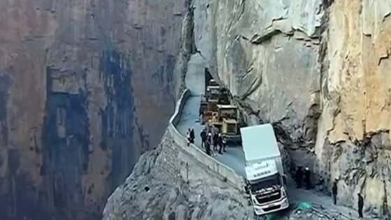 Гружёная фура в буквальном смысле зависла на краю пропасти на серпантине у населённого пункта Шаньси, Китай. Чтобы безопасно эвакуировать многотонный грузовик, организовали целую спецоперацию.