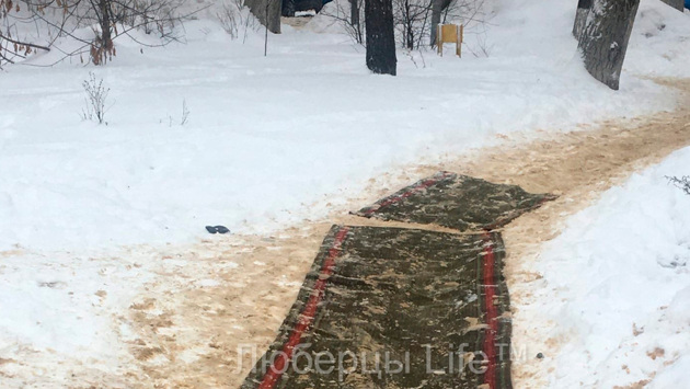 Россияне в группе «ВКонтакте» «Люберцы Life™» обсудили новый способ использования ковров зимой. Жители Подмосковья застилают ими скользкие участки пути.