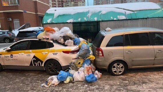 Жители Балашихи завалили мусором такси, загородившее контейнерную площадку