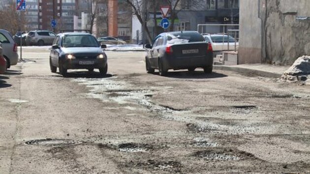 Пешие, увидев машины, отходят в сторону, чтобы не окатило грязью. Местные сравнивают состояние асфальта на этом участке и у себя во дворе.