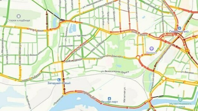 В Калининграде на проспекте Мира образовалась четырёхкилометровая пробка. Информацию опубликовал сервис «Яндекс.Карты».