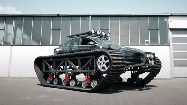 Энтузиасты решили превратить Tesla Model 3 в танк с гигантскими гусеницами. Получился 6-тонный электрический внедорожник.