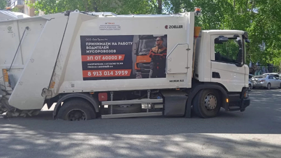 На кадрах отчетливо видно, как заднее колесо мусоровоза практически полностью провалилось в асфальт.