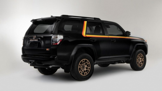 Как следует из названия, это специальное издание, приуроченное к 40-летию 4Runner с тех пор, как Toyota оснастила пикап кабиной из стекловолокна и добавила дополнительный ряд сидений еще в 1983 году.Специальное издание 40th Anniversary основано на SR5 Premium класса 4Runner и выпускается только с колесной формулой 4×4. Это пакет внешнего вида, который включает в себя легкосплавные диски бронзового цвета, решетку радиатора в цвет кузова, бронзовый значок на задней двери и характерные желтые, оранжевые и красные полосы по всему кузову. Пакет также предлагает детали интерьера, такие как бронзовая прострочка сидений, бронзовая вышитая крестиком ручка переключения передач и стандартный люк с электроприводом.