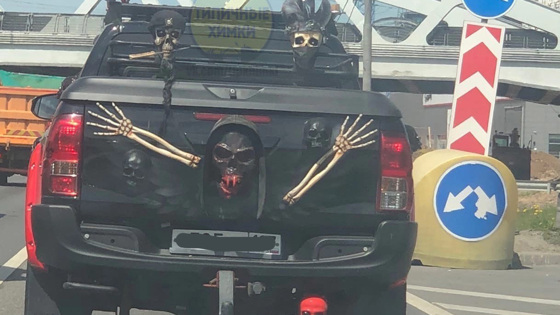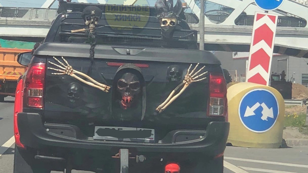 Автор поста рассказал, что заметил необычный внедорожник у Репинской развязки. На задней панели черного автомобиля можно увидеть несколько стилизованных черепов в разнообразных головных уборах.