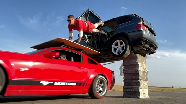 Для выполнения трюка BMW X5 подняли на пару метров с помощью бетонных блоков. Разогнавшись на крыше Ford Mustang, Чеботарев сумел пролететь сквозь салон внедорожника.
