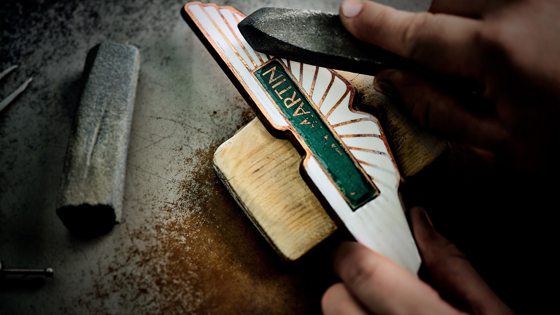 Создание модернизированной эмблемы Aston Martin поручили британскому графическому дизайнеру Питеру Сэвиллу. В рамках презентации логотипа автопроизводитель поделился серией фотографий и видео о том, как ремесленники ювелирного квартала Бирмингема вручную изготавливают эмблемы. Они появятся на всех новых автомобилях марки.