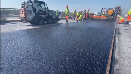На 4‑м этапе М‑12, Муром – Арзамас, началась первая укладка литого асфальтобетона на пролетном строении искусственного сооружения. Работы выполняются на путепроводе над проездом для с/х техники и проходом для диких животных, расположенном на 243‑м км. Доставляется смесь на место производства «кохером» – специальным транспортом, оборудованным котлом-термосом на автомобильном шасси с функциями поддержания заданной температуры и равномерного перемешивания. Далее происходит распределение по всей ширине полотна специальным укладчиком при температуре от 200 до 215 градусов Цельсия. Важнейшим свойством литого асфальтобетона является его водонепроницаемость, что улучшает гидроизоляцию плиты проезжей части мостовых сооружений. Среди других преимуществ этого типа покрытия – отсутствие необходимости уплотнения катками, высокое сцепление с вышележащими слоями, упругость и эластичность. Литой асфальтобетон планируется уложить в нижнем слое дорожного полотна на всех искусственных сооружениях 4‑го этапа. Этот участок будущей скоростной трассы М‑12 проходит по территории Владимирской и Нижегородской областей, от Мурома до Арзамаса.