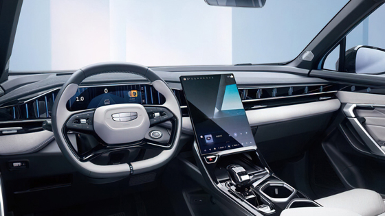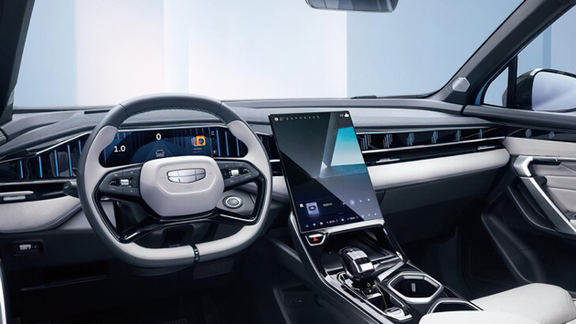 В салоне, оформленном в светлой гамме, установлен вертикально ориентированный тачскрин мультимедийной системы. Его диагональ составляет 13,2 дюйма, а разрешение — 1440 на 1920 пикселей. «Мультимедийка» работает на базе платформе Qualcomm с восьмиядерным чипом Snapdragon SA8155P, которую также использует марка XPeng, и с фирменной операционной системой Geely Galaxy OS Air.