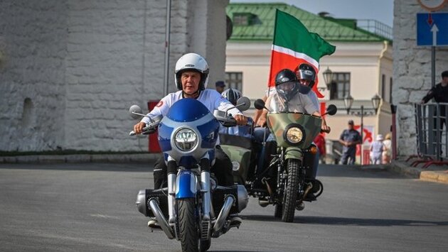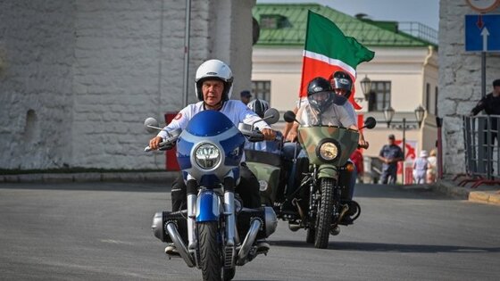 Сегодня в Казани прошел мотофестиваль "Два Кремля". Частью масштабного мероприятия стал мотопробег, колонну байкеров возглавил президент РТ Рустам Минниханов. Мотоциклисты стартовали с площади 1 Мая и проехали по улицам города через мост Миллениум до Чаши.