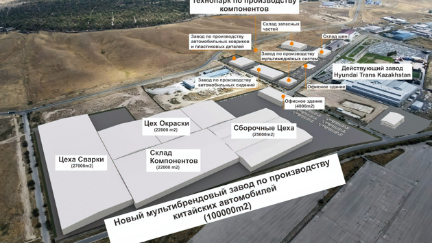 На опубликованном слайде можно рассмотреть расположение цехов на территории в 100 тысяч квадратных метров. На карте присутствуют цеха сварки и окраски, сборочные цеха площадью 25 тысяч квадратных метров, а также несколько заводов-поставщиков, выпускающих автомобильные кресла, мультимедийные системы, коврики и пластиковые детали. Размечены и складские помещения. Новый завод будет соседствовать с Hyundai Trans Kazakhstan.