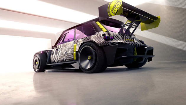 Развитый аэродинамический обвес, необычная расцветка с желтыми и фиолетовыми элементами, а также пиксельная оптика придают Renault 5 Turbo 3E «киберпанковый» вид. В салоне установлены пара кресел-ковшей и каркас безопасности, имеется с десяток креплений для экшн-камер и десять небольших экранов, на каждом из которых отображается определенная информация.