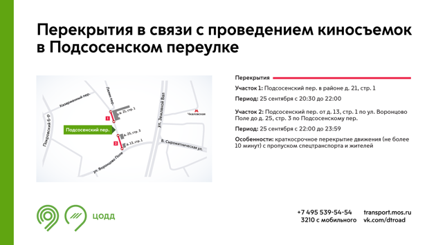 Так, 25 сентября с 20:30 до 22:00 перекроют движение в районе дома 21, строения 1 в Подсосенском переулке. С 22:00 до 23:59 водителям будет недоступен участок от дома 13, строения 1 на улице Воронцово Поле до дома 25, строения 3 в Подсосенском переулке. Перекрытия связаны с проведением киносъемок.