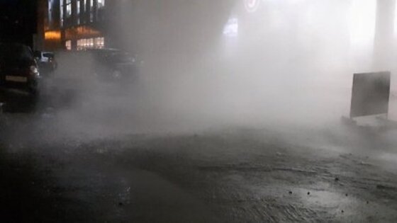 Из-под крышки люка вырвалась мощная струя горячей воды, достигавшая нескольких метров в высоту. Припаркованные поблизости автомобили скрылись в образовавшейся паровой завесе. Фонтан бил около получаса.