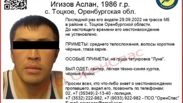 По данным «ОренСпас», житель Стерлитамака Аслан Игизов пропал без вести в Тоцком районе Оренбуржья 29 сентября 2022 года. В последний раз он был замечен на трассе М-5 «Урал» в 2-3 километрах от села Тоцкое. До настоящего момента о его местонахождении ничего неизвестно.