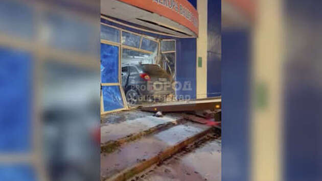 Пявилось видео момента ДТП, где кроссовер протаранил торговый центр