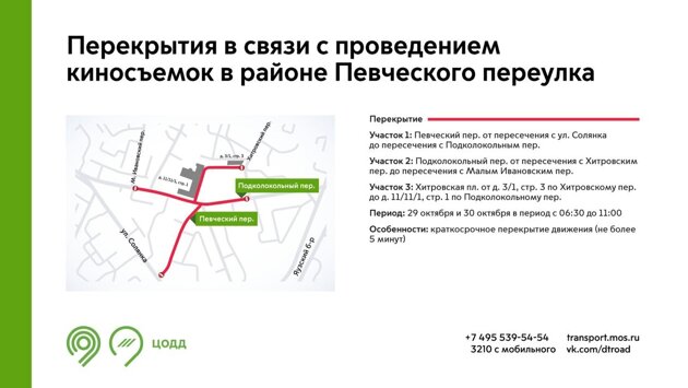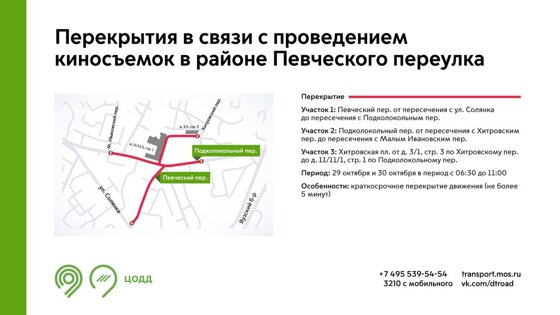 С 29 октября на некоторых улицах в центре столицы временно изменится схема движения транспорта. Меры связаны с проведением киносъемок. Ограничения затронут несколько улиц в Таганском и Басманном районах. Так, в период с 29 по 30 октября перекрытия будут действовать в Подколокольном и Певческом переулках и на Хитровской площади с 10:00 до 14:00, уточнили на сайте мэра Москвы. В Хохловском переулке от Покровского бульвара до пересечения с Колпачным переулком и на участке примыкающего к нему Подкопаевского переулка будет перекрыто движение в период с 12:00 до 18:00. Стоит отметить, что изменения коснутся и районов Красносельский и Арбат. По информации с сайта мэра Москвы, с 30 октября по 30 ноября на Поварской улице в районе дома 21/17, строения 1 будет ограничено движение по одной полосе. Там также нельзя будет парковаться. Это связано со строительством инженерных сетей. Водителям рекомендуют заранее планировать маршрут и выбирать пути объезда.