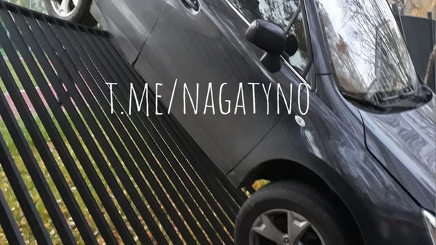На опубликованных кадрах видны последствия заезда задним ходом автомобиля на забор. Машина примяла ограждение и повисла на нем.