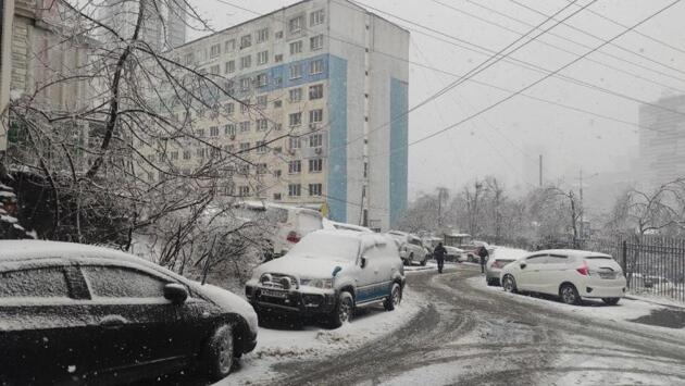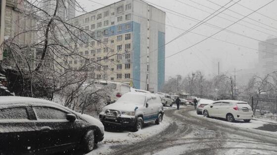 В первой половине дня во Владивостоке начался снег, который вечером, согласно прогнозам синоптиков, перейдет в дождь и дождь со снегом. Осадки сопровождаются ветром, скорость которого достигает 16 м/с. На дорогах гололедица.