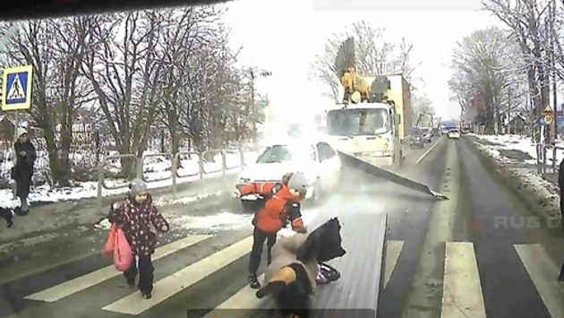 В Южно-Сахалинске из кузова грузовика выпали плохо закрепленные листы металла и прилетели под ноги пешеходам, которые переходили улицу по "зебре". Видеозапись инцидента опубликована в паблике "Русские дороги" в VK. На записи видно, что грузовик с манипулятором останавливается перед пешеходным переходом за легковым автомобилем, чтобы пропустить людей. В этот момент листы металла в кузове по инерции начинают двигаться вперед, падают на крышу стоящего перед грузовиком легкового автомобиля и прилетают под ноги пешеходам, переходящим дорогу. Всего на переходе в момент инцидента находились шесть человек, включая четверых детей. Незакрепленный груз сбил с ног женщину и ребенка. О состоянии пострадавших в результате необычного ДТП не сообщается. Ранее стало известно, что в Рязанской области 44-летняя женщина за рулем Mitsubishi задела автомобиль Volkswagen, который протаранил еще две машины. Пострадали пять человек.