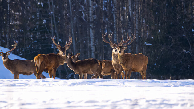 На снимке запечатлен кусок проезжей части, который перегородили животные. Также видно, что большинство оленей ушли на заснеженное поле сбоку от трассы.