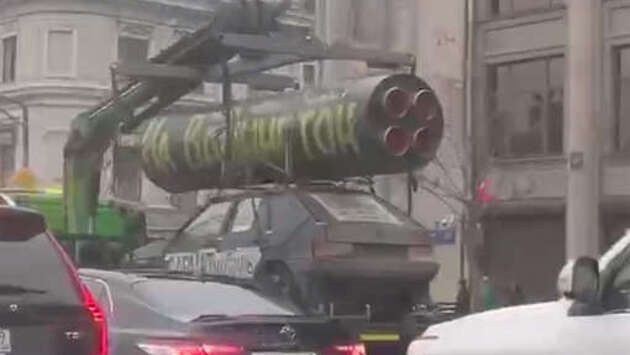 На легковом автомобиле «ВАЗ-2109» была надпись «сарматмобиль». На крыше машины располагалась конструкция, напоминающая баллистическую ракету, а на ней — надпись «На Вашингтон».