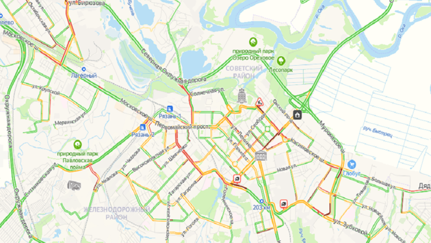 По традиции встал центр - тут проблем добавило ДТП на Первомайском проспекте. осложнен выезд из микрорайонов - особенно сложно приходится жителям Дашково-Песочни, Канищева и Приокского. Так, низкая скорость движения на Касимовском шоссе, стоят проезд Шабулина, улицы Бирюзова и Интернациональная. Крансым на карте отмечен и съезд с Северной окружной на Солнечную.