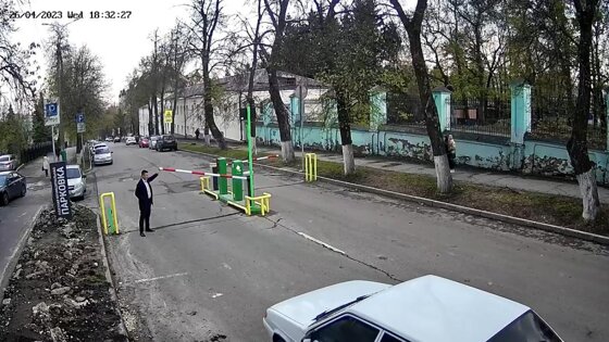 В объектив камеры попали автомобиль «Лада» и шлагбаум, закрывающий выезд с парковки. Возле него стоят двое мужчин. Один возвращается в машину, а другой через пару секунд ожидания поднимает шлагбаум рукой, обманывая систему.