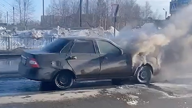 На центральной улице Нового Уренгоя загорелся автомобиль. ВИДЕО