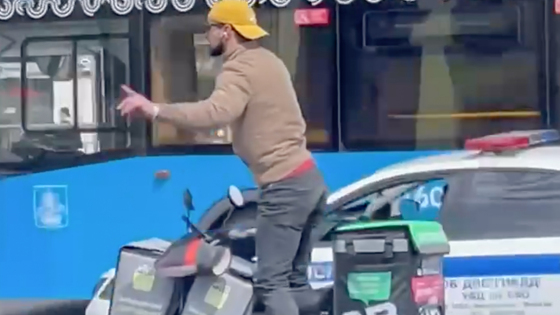 «Слишком крутой заказ везет», — подписали администраторы сообщества ролик. На видео доставщик едет на электровелосипеде, стоя и бросив руль, по выделенной для движения общественного транспорта полосе мимо двух патрульных машин ДПС.