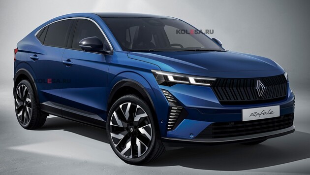 Ещё художник снабдил будущий кроссовер большой чёрной радиаторной решёткой, в центре которой находится по-новому оформленный логотип в виде ромба, а от него в стороны расходятся «уголки». В нижнюю часть переднего бампера интегрирован крупный воздухозаборник с рисунком в виде тонких горизонтальных полос. У автомобиля на рендере есть чёрный обвес по периметру кузова, такого же цвета корпуса боковых зеркал и крыша, а верхняя кромка боковой линии остекления отделана хромом. Предполагается, что у Rafale задние фонари будут отличаться от «родственника».
