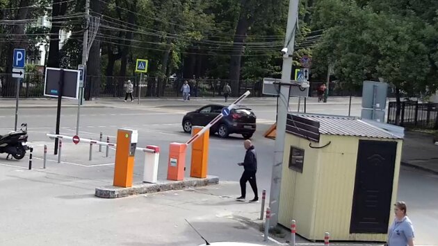Вскоре мужчина спокойно покинул парковку, шлагбаум опустился за ним.